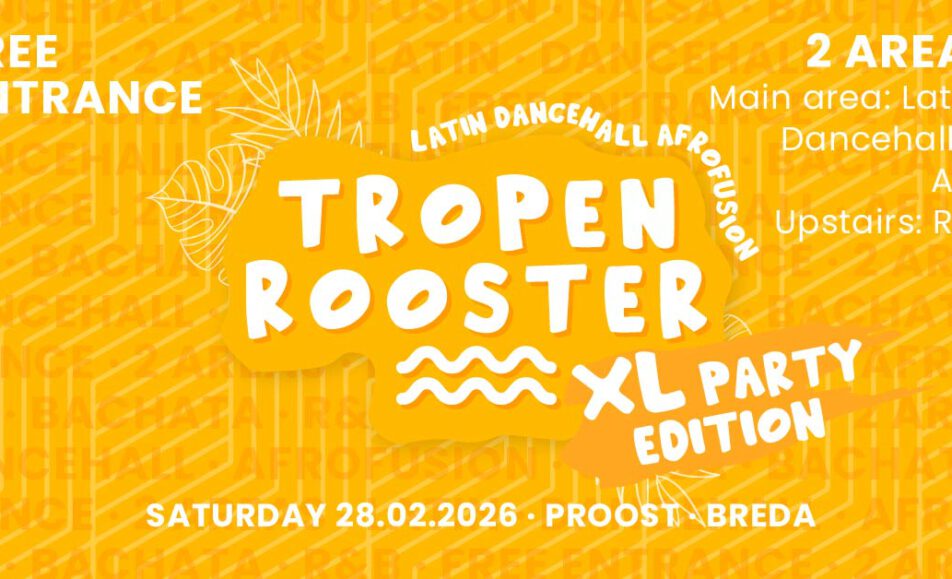 XL Party! Hola Breda! Tropenrooster komt op 28 februari weer naar Proost XL-editie! Niet één, maar twee area’s gevuld met de heetste riddims — precies zoals je mag verwachten bij een Tropenrooster fiesta! Main area: de beste latin, dancehall en afro tunes...